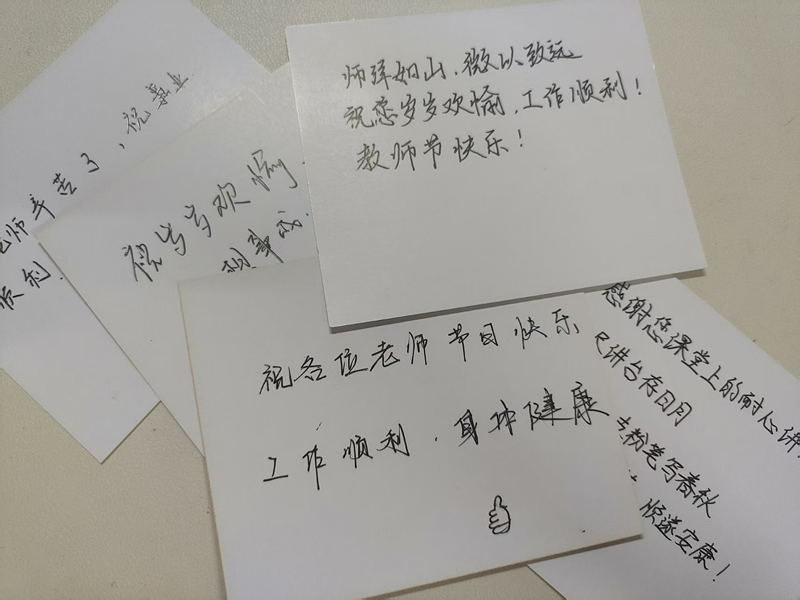 9月10日早学院在一楼大厅LED屏幕滚动显示“弘扬践行教育家精神,加快建设教育强国”“老师,您辛苦了!”“教师节快乐!”字幕,在学院官网对2025年学院师德先进、优秀教师风采进行了展示,营造出浓厚的尊师重教氛围,增强了教师的职业荣誉感和归属感。9月8日至9日,学院在一楼大厅举办"手写祝福传师恩"贺卡赠送活动。百余名学生踊跃参与,用精心书写的贺卡表达对老师的感恩之情。"感谢您课堂上的耐心讲解""愿您桃李满天下"......一句句真挚的祝福让贺卡成为承载师生情谊的珍贵载体。教师节当天,学生们将这份特殊礼物送达老师手中,温馨场面令人动容。