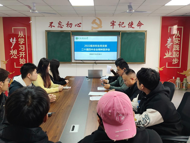 2025年10月30日下午,通信学院2022级本科生党支部于一站式社区召开支部大会,专题学习党的二十届四中全会精神。支部书记蒋飞主持会议。学院党委副书记张振中、22级毕业班全体辅导员及支部全体党员参加。