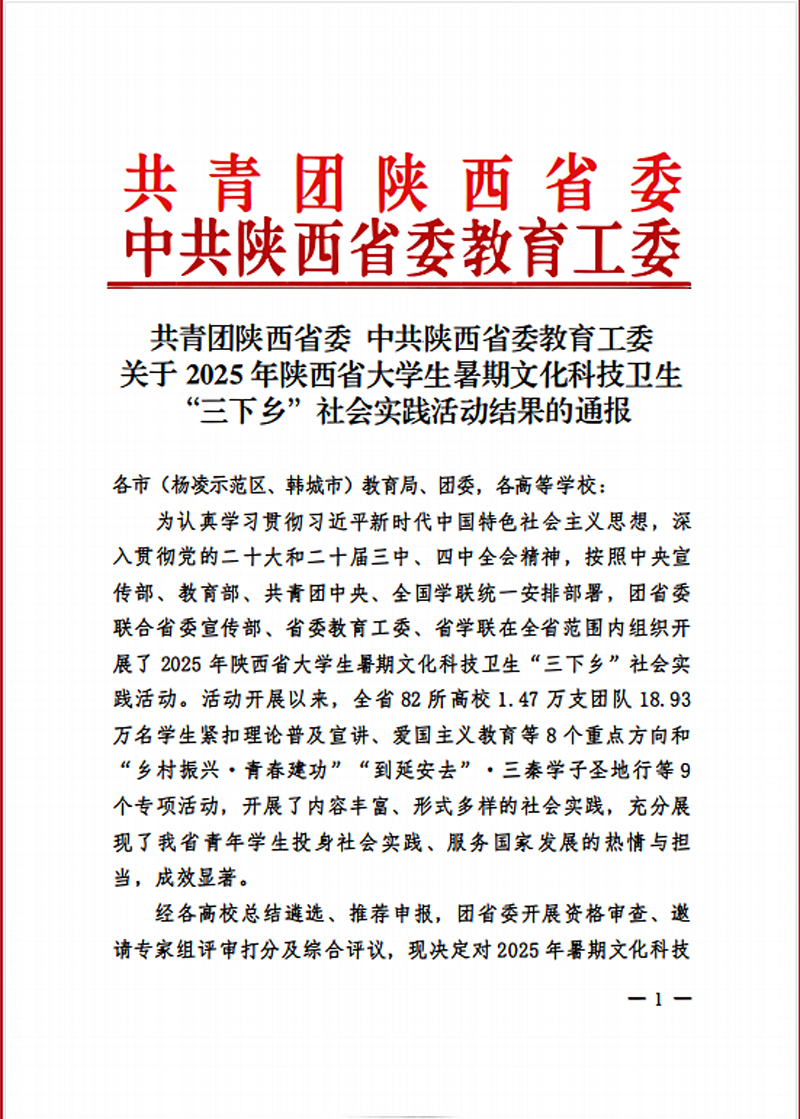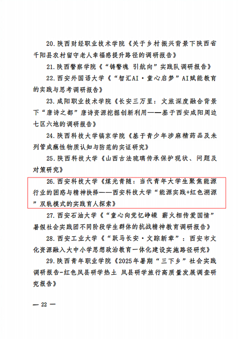近日,从共青团陕西省委、中共陕西省委教育工委联合发布的《2025年陕西省大学生暑期文化科技卫生“三下乡”社会实践活动结果的通报》中传来喜讯。西安科技大学通信学院“煤光青随”社会实践团队撰写的调研报告《煤光青随:当代青年大学生聚焦能源行业的困惑与精神抉择——西安科技大学“能源实践+红色溯源”双轨模式的实践育人探索》,凭借选题新颖、主题鲜明、调研扎实及高质量的撰写水平,被评为省级社会实践优秀调研报告。