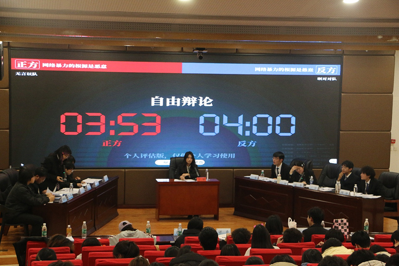 从全院8支参赛队伍中突围的“无言以队”与“啊对对”队,围绕“网络暴力的根源究竟是恶意(正方)/是愚蠢(反方)”展开激烈交锋,辩论现场气氛浓烈,从网络环境特性谈到人性认知,在这场辩论中探寻抵制网络暴力的破局思路。
