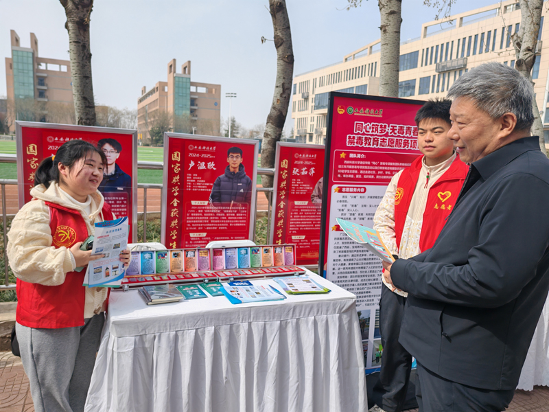 在校内专场,校党委书记来兴平、党委副书记陈春林在志愿服务点与志愿者进行亲切交流,鼓励大家开展好志愿服务活动,以校园“戒烟”行动拓展禁毒宣传校园场景。活动现场,志愿者们围绕禁毒知识普及,通过专题宣讲、毒品仿真模型展示、现场知识问答等形式,向社区居民、在校师生系统讲解传统毒品、新型毒品及伪装毒品的种类、危害和防范方法。志愿者结合典型案例,用通俗易懂的语言提醒大家认清毒品陷阱、增强警惕意识,引导群众自觉远离毒品、积极参与禁毒斗争。活动结束后,志愿者们现场发放《禁毒知识手册》《防范新型毒品指南》等宣传资料800余份。